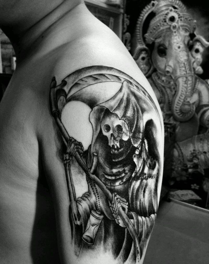 死神盖图纹身图片_手臂传统宗教成品纹身图案