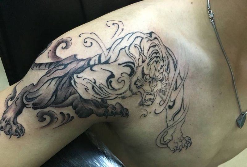 当前位置: 首页 >广东省深圳市纹身店-名海刺青纹身图案>东北虎纹身图片_成品肩部传统动物纹身图案