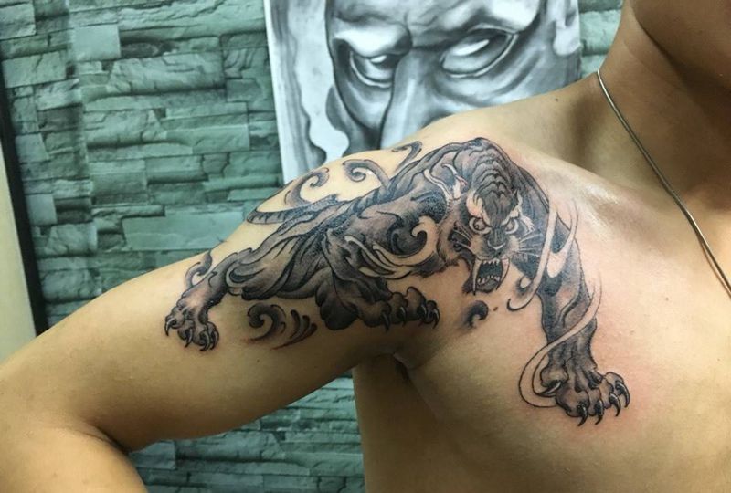 当前位置: 首页 >广东省深圳市纹身店-名海刺青纹身图案>东北虎纹身图片_成品肩部传统动物纹身图案