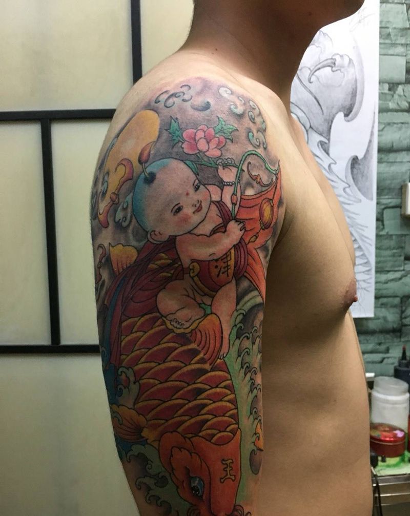彩色招财鱼纹身图片_成品手臂传统纹身图案