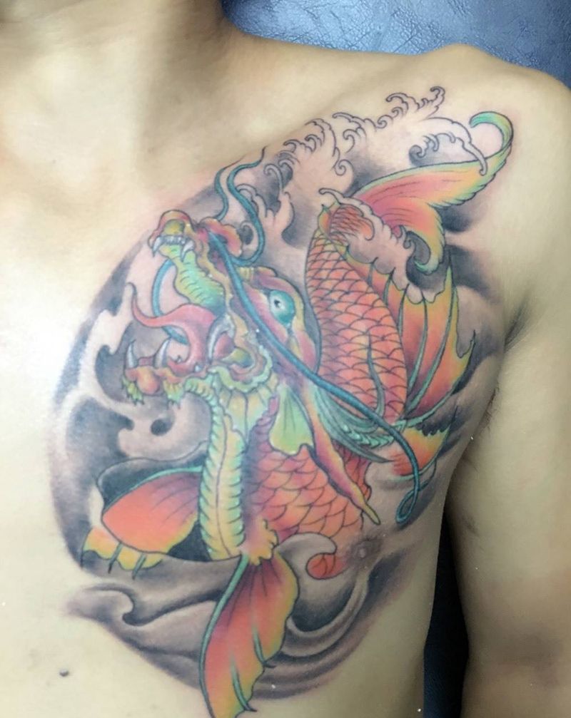当前位置: 首页 >广东省深圳市纹身店-名海刺青纹身图案>龙鱼纹身图片_成品胸部传统动物纹身图案