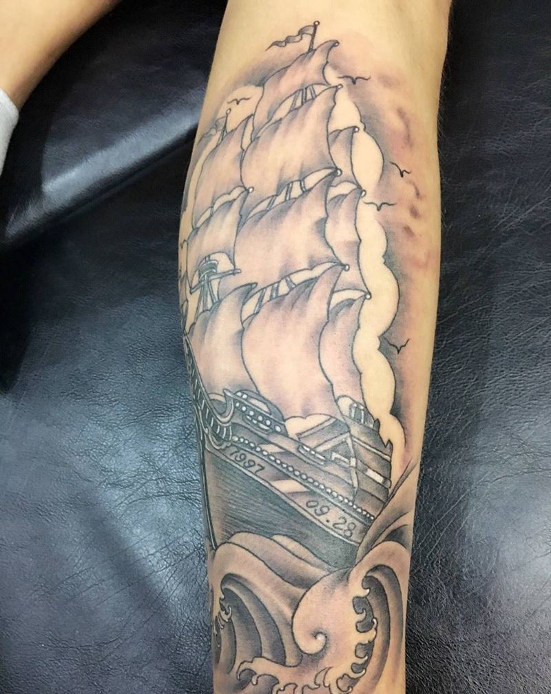 帆船纹身图片_成品腿部静物纹身图案