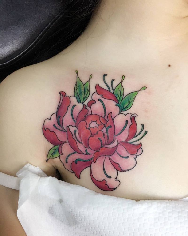 当前位置: 首页 >广东省深圳市纹身店-名海刺青纹身图案>牡丹纹身图片_成品胸部传统植物纹身图案