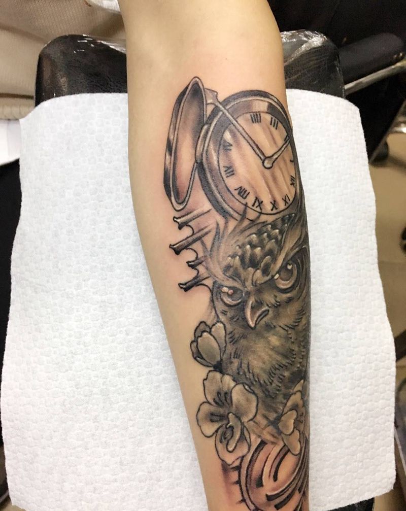 当前位置: 首页 >广东省深圳市纹身店-名海刺青纹身图案>猫头鹰纹身图片_成品手臂动物纹身图案
