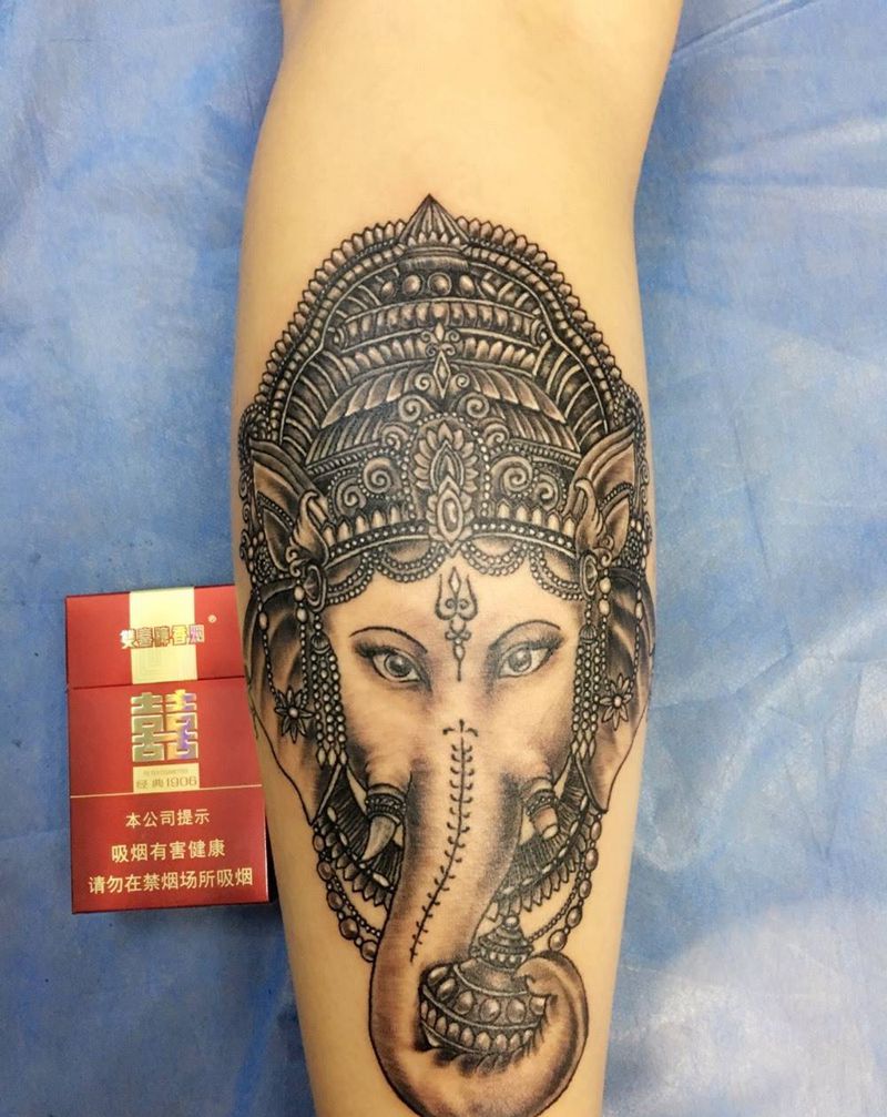 小象纹身图片_成品腿部传统鬼神纹身图案