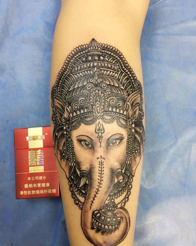小象纹身图片_成品腿部传统鬼神纹身图案