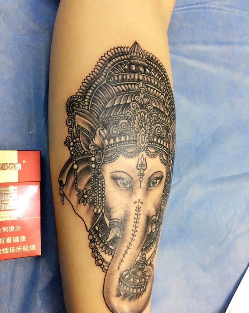 小象纹身图片_成品腿部传统鬼神纹身图案