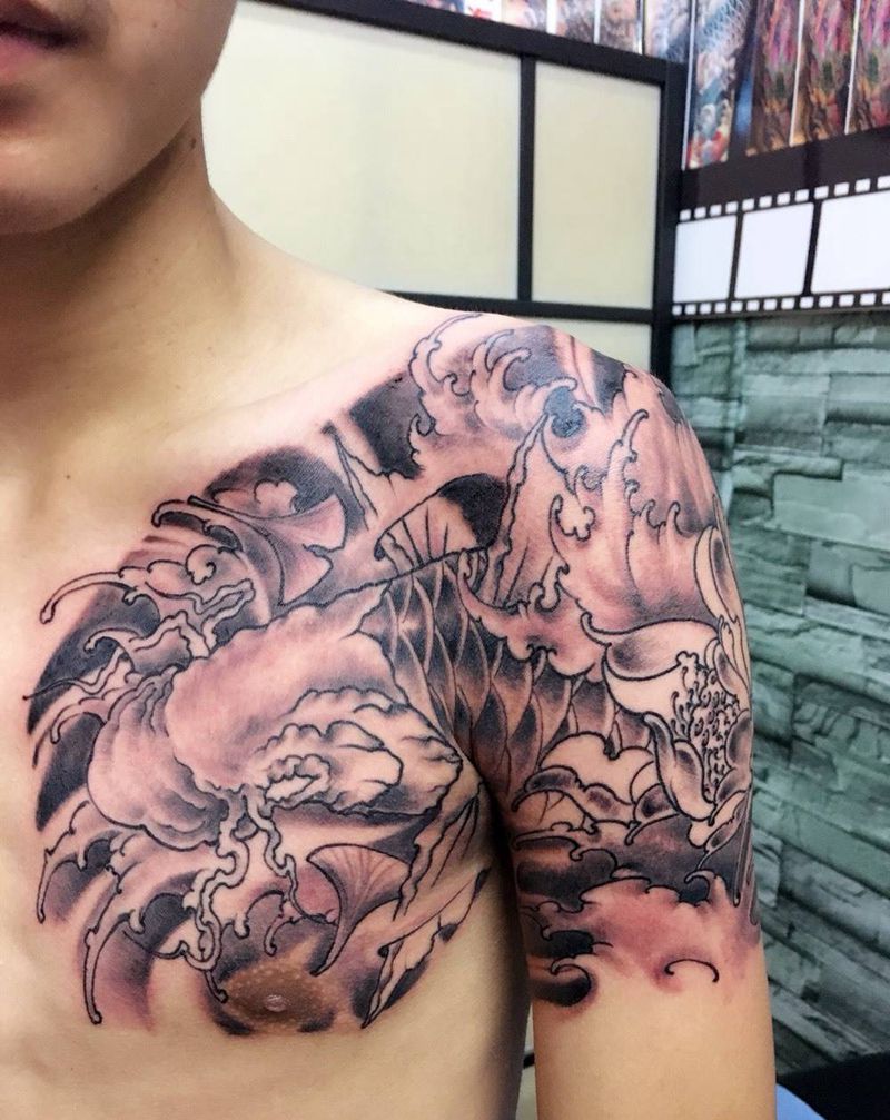 当前位置: 首页 >广东省深圳市纹身店-名海刺青纹身图案>鱼儿纹身图片_成品胸部传统动物纹身图案