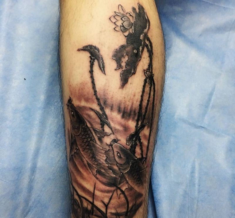 当前位置: 首页 >广东省深圳市纹身店-名海刺青纹身图案>鱼儿纹身图片_成品腿部传统动物纹身图案