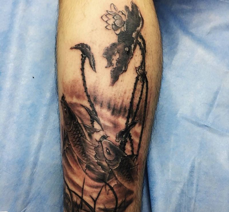 当前位置: 首页 >广东省深圳市纹身店-名海刺青纹身图案>鱼儿纹身图片_成品腿部传统动物纹身图案