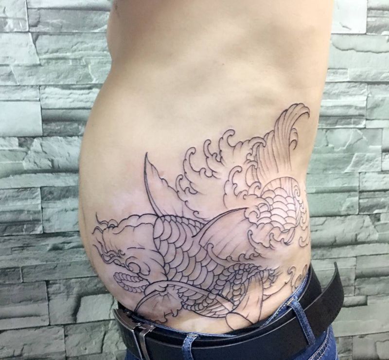 鱼纹身图片_成品腹部传统动物纹身图案