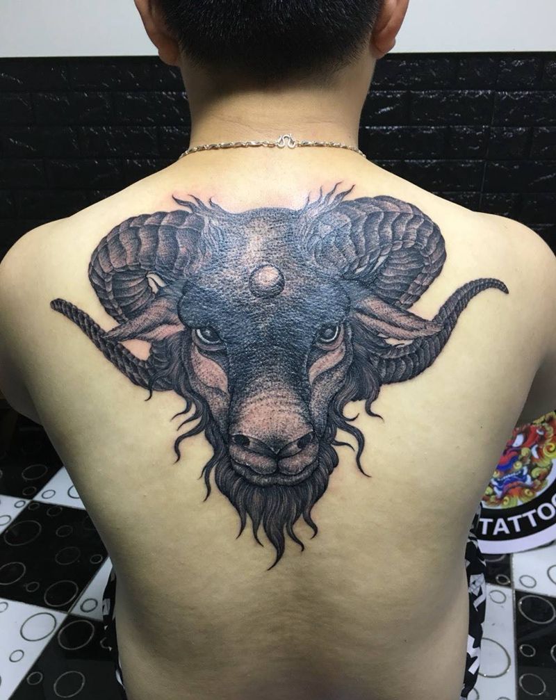 当前位置: 首页 >广东省深圳市纹身店-名海刺青纹身图案>牛头盖图纹身图片_成品背部传统动物纹身图案
