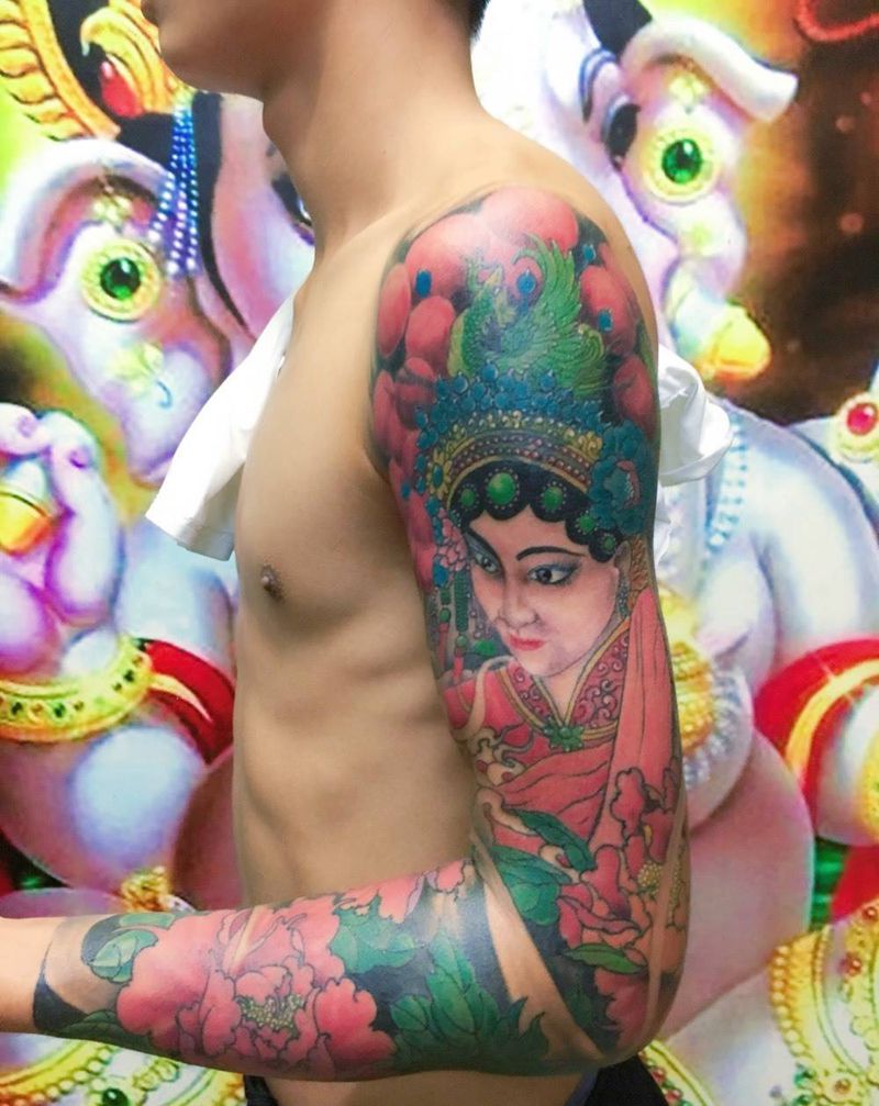 当前位置: 首页 >广东省深圳市纹身店-名海刺青纹身图案>盖图花臂纹身图片_成品手臂传统人物植物纹身图案