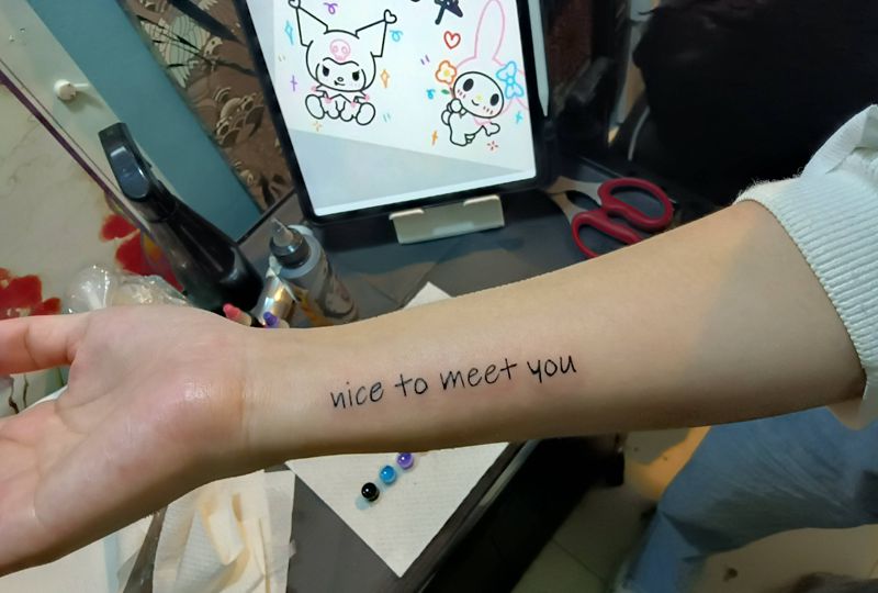 当前位置: 首页 >广东省深圳市纹身店-深圳-七道刺青社TATTOO STUDIO纹身图案>很高兴认识你纹身图片_手臂花体字纹身图案