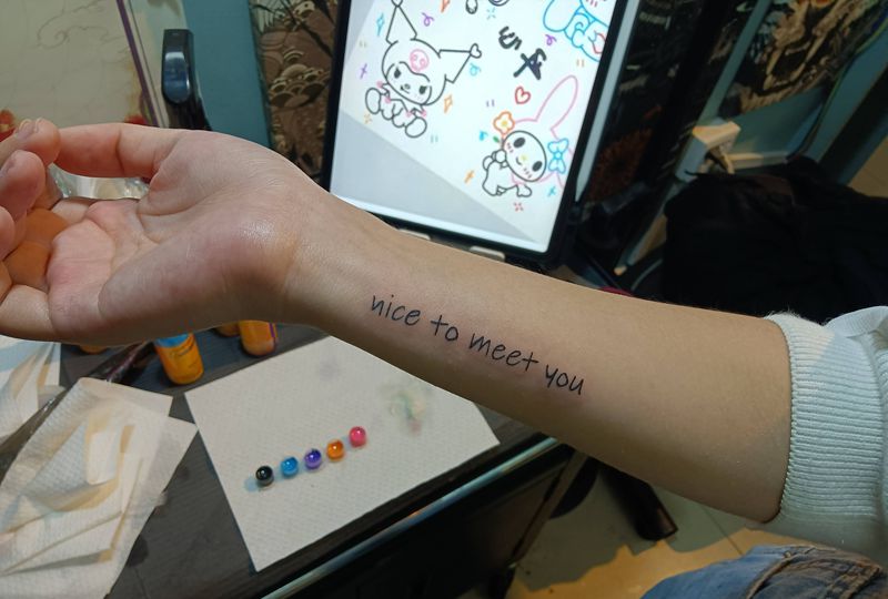 当前位置: 首页 >广东省深圳市纹身店-深圳-七道刺青社TATTOO STUDIO纹身图案>很高兴认识你纹身图片_手臂花体字纹身图案