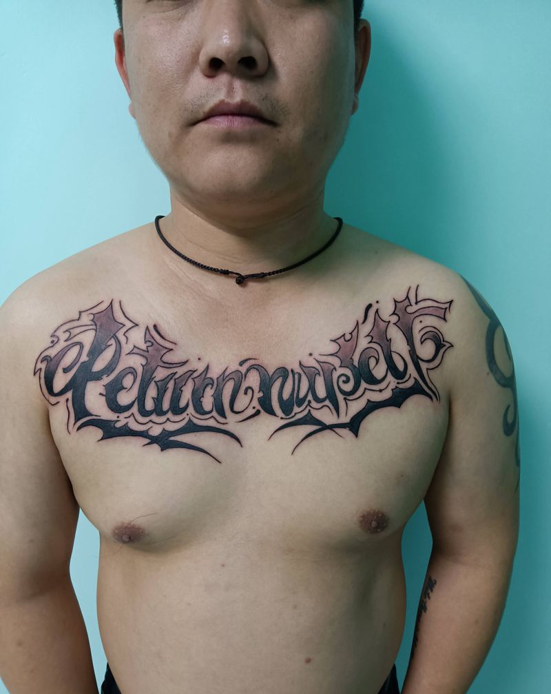 当前位置: 首页 >广东省深圳市纹身店-深圳-七道刺青社TATTOO STUDIO纹身图案>花体字纹身图片_胸部花体字纹身图案