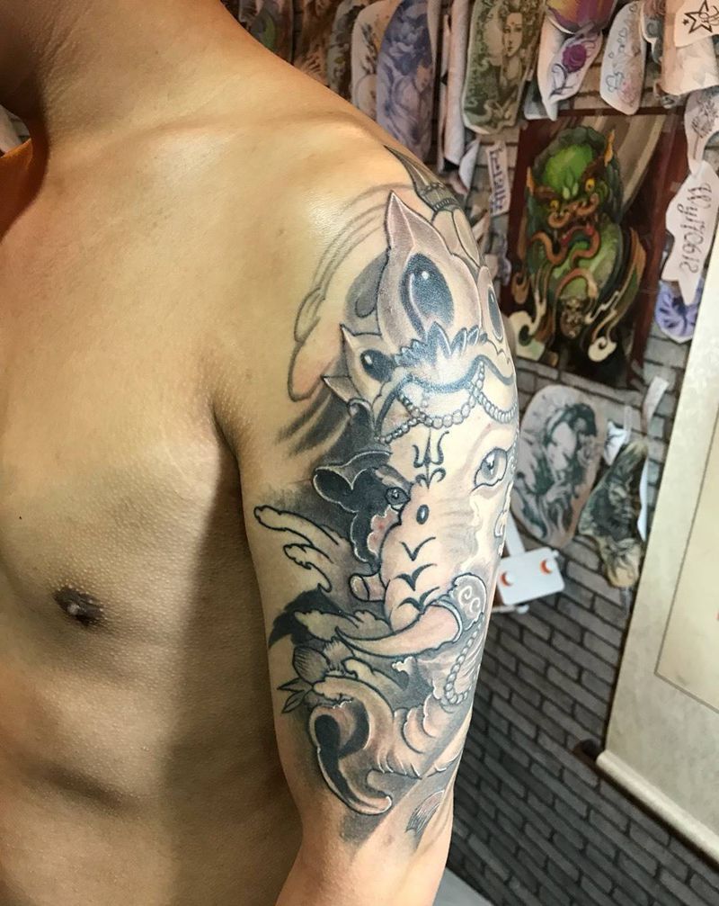 当前位置: 首页 >广东省深圳市纹身店-深圳-七道刺青社TATTOO STUDIO纹身图案>象神纹身图片_成品肩部手臂传统鬼神动物纹身图案