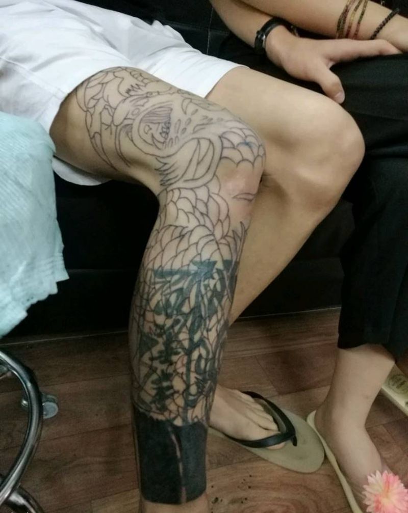 • T网红王老大花腿龙纹身图片_腿部新传统纹身图案