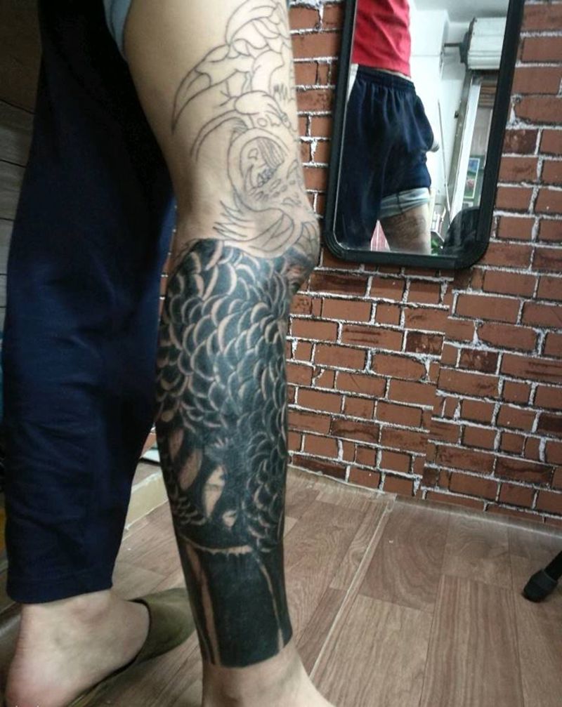• T网红王老大花腿龙纹身图片_腿部新传统纹身图案