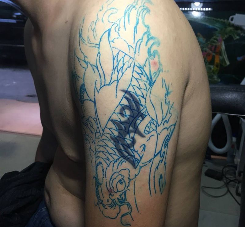 • T网红王老大花腿龙纹身图片_腿部新传统纹身图案