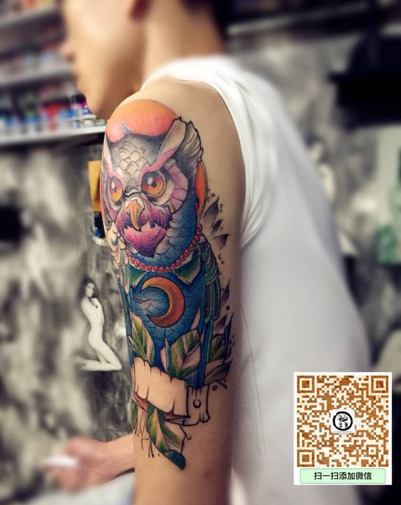 重彩猫头鹰纹身图片