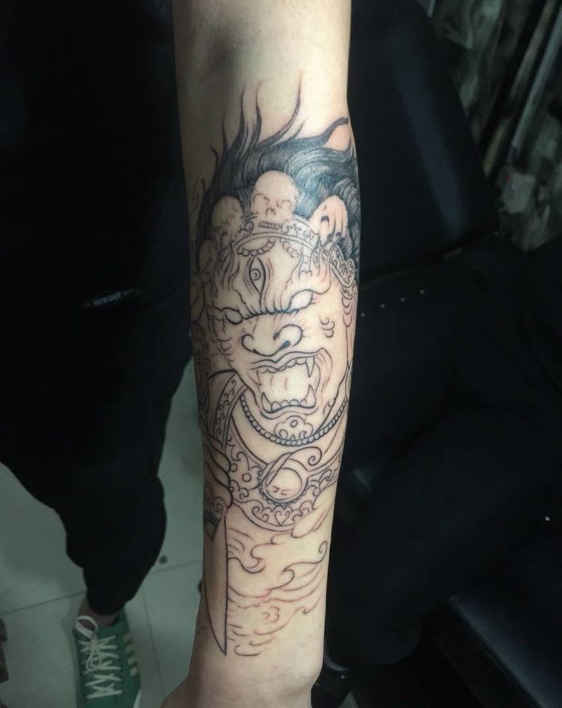 当前位置: 首页 >广东省深圳市纹身店-深圳鬼舞刺青工作室纹身图案>大黑天包小臂未完纹身图片
