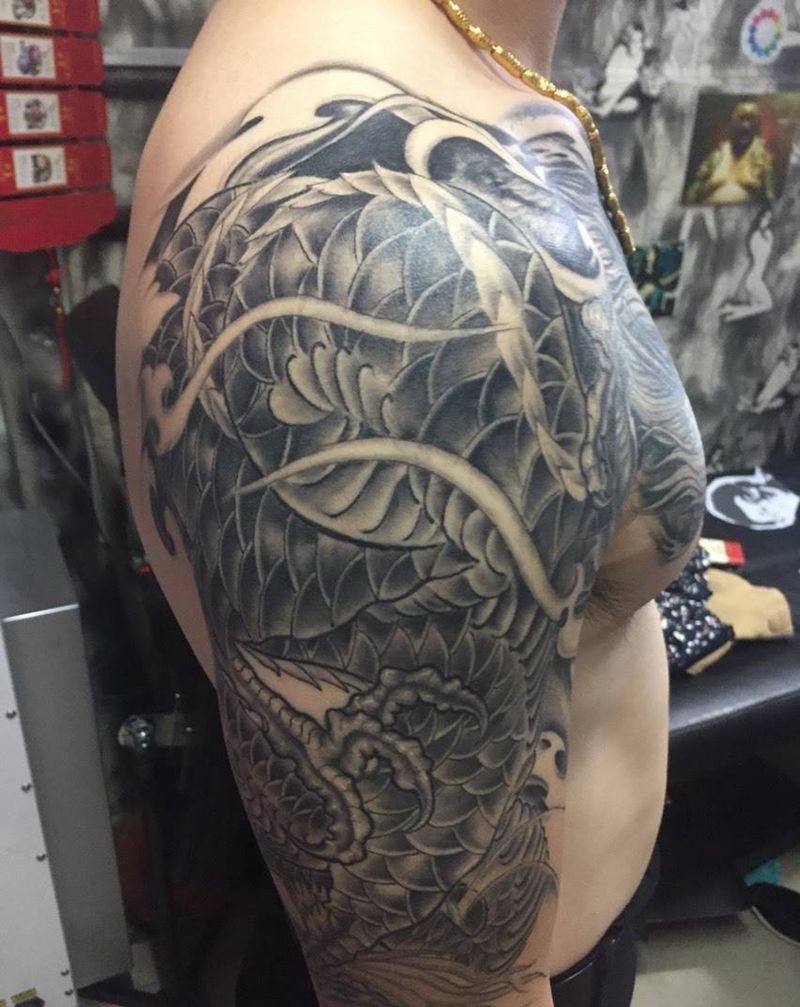 当前位置: 首页 >广东省深圳市纹身店-深圳鬼舞刺青工作室纹身图案>披肩龙恢复后纹身图片