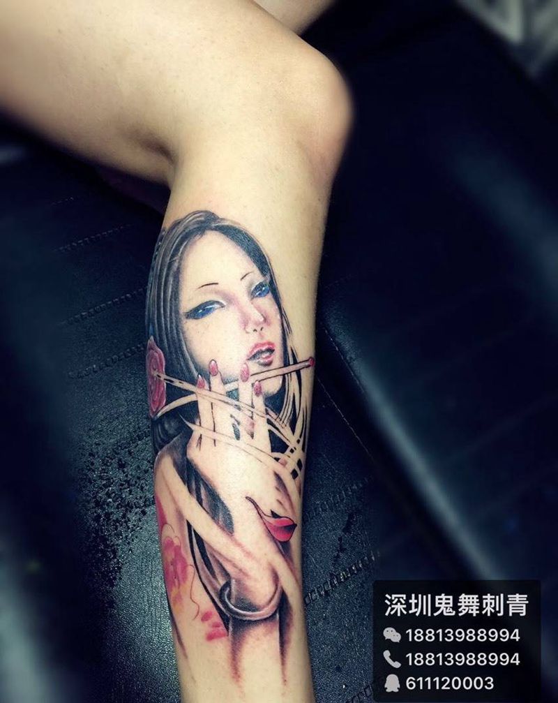 当前位置: 首页 >广东省深圳市纹身店-深圳鬼舞刺青工作室纹身图案>小腿艺妓纹身图片