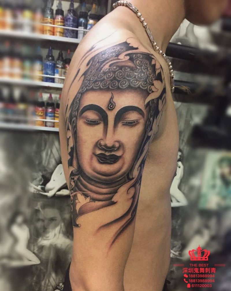 当前位置: 首页 >广东省深圳市纹身店-深圳鬼舞刺青工作室纹身图案>心中有曲自然嗨,心中有佛无需拜纹身图片
