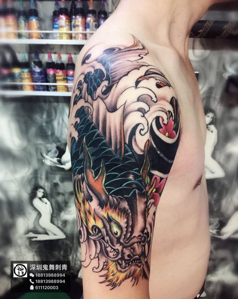• T网红王老大花腿龙纹身图片_腿部新传统纹身图案