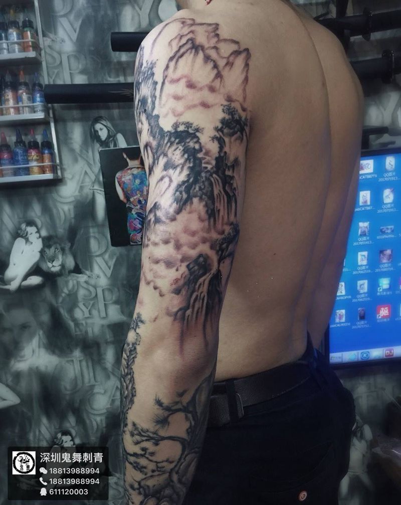 当前位置: 首页 >广东省深圳市纹身店-深圳鬼舞刺青工作室纹身图案>山水画花臂纹身图片