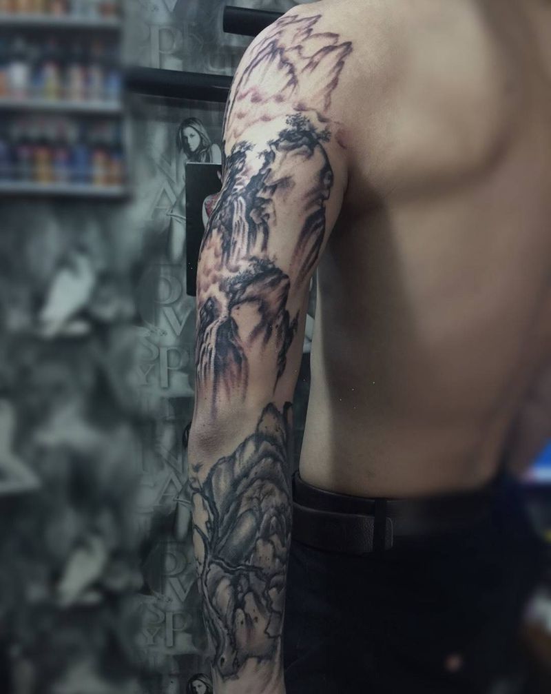 当前位置: 首页 >广东省深圳市纹身店-深圳鬼舞刺青工作室纹身图案>山水画花臂纹身图片