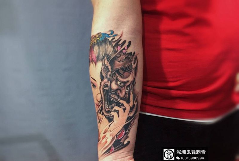 当前位置: 首页 >广东省深圳市纹身店-深圳鬼舞刺青工作室纹身图案>包小臂艺妓纹身图片