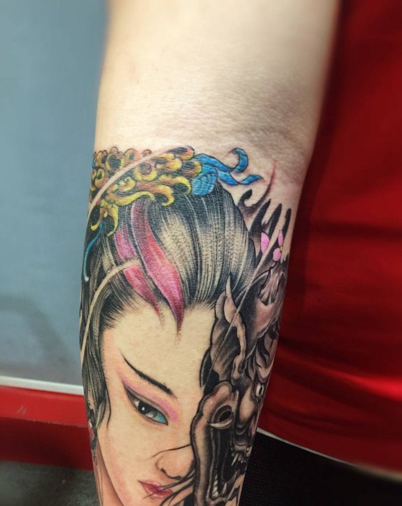 当前位置: 首页 >广东省深圳市纹身店-深圳鬼舞刺青工作室纹身图案>包小臂艺妓纹身图片