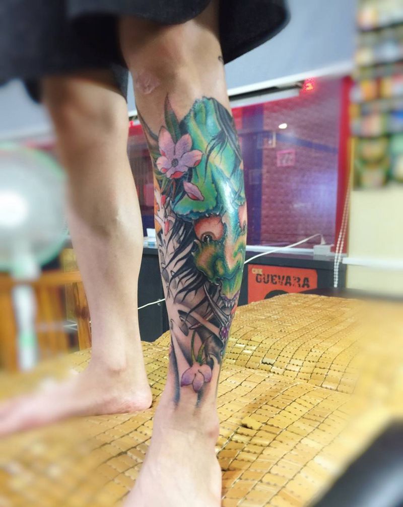 • T网红王老大花腿龙纹身图片_腿部新传统纹身图案