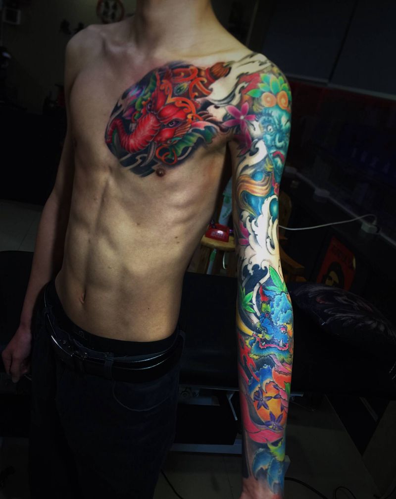 当前位置: 首页 >广东省深圳市纹身店-深圳鬼舞刺青工作室纹身图案>半甲花臂纹身图片_手臂新传统纹身图案