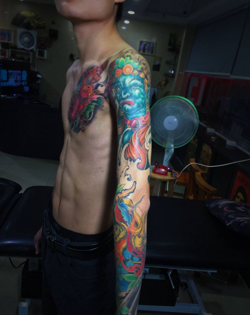 当前位置: 首页 >广东省深圳市纹身店-深圳鬼舞刺青工作室纹身图案>半甲花臂纹身图片_手臂新传统纹身图案