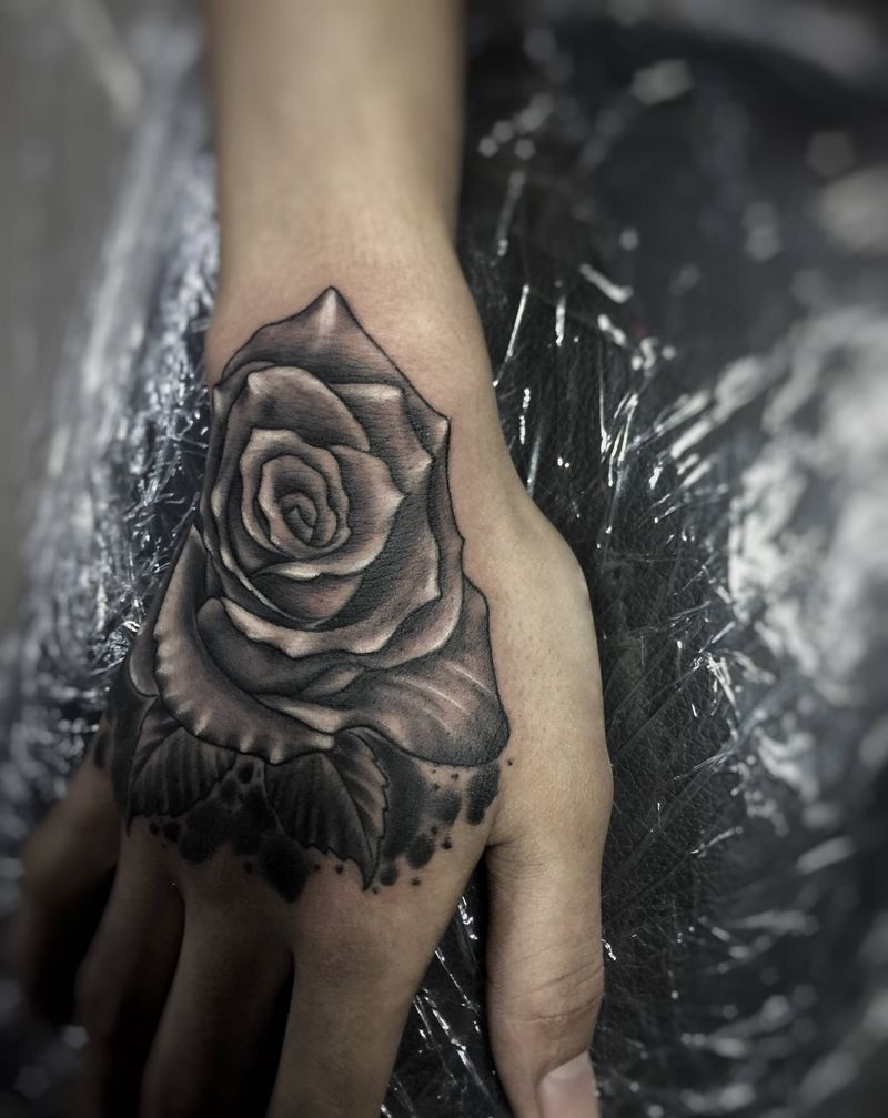 • 手背潮流时尚的玫瑰花眼睛纹身图案