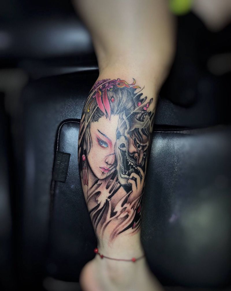 当前位置: 首页 >广东省深圳市纹身店-深圳鬼舞刺青工作室纹身图案>小腿艺妓纹身图片_腿部纹身图案