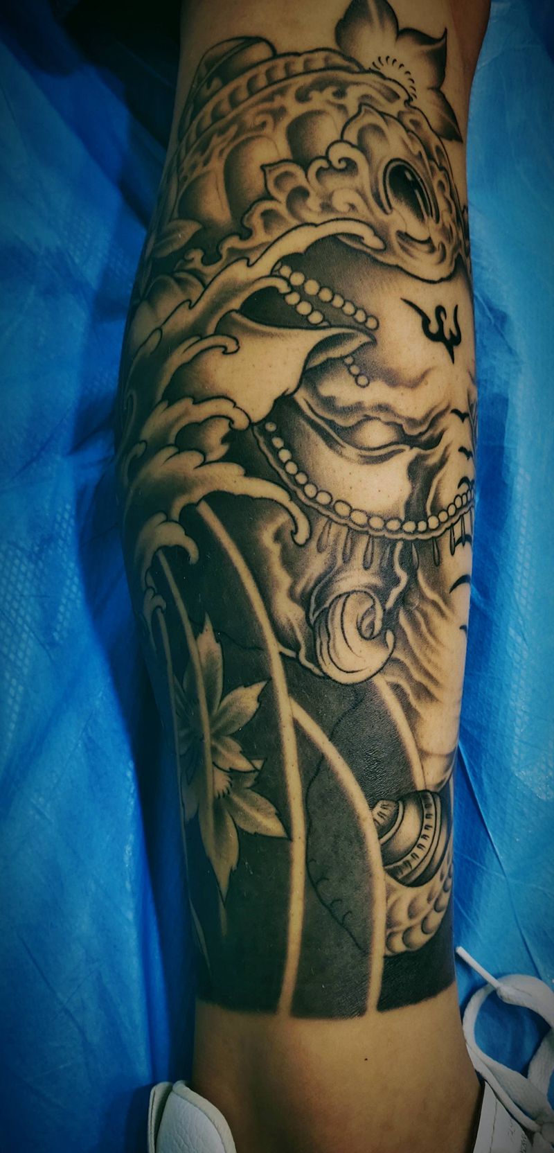 当前位置: 首页 >广东省深圳市纹身店-深圳玉锦刺青纹身图案>象神莲花纹身图片_腿部纹身图案