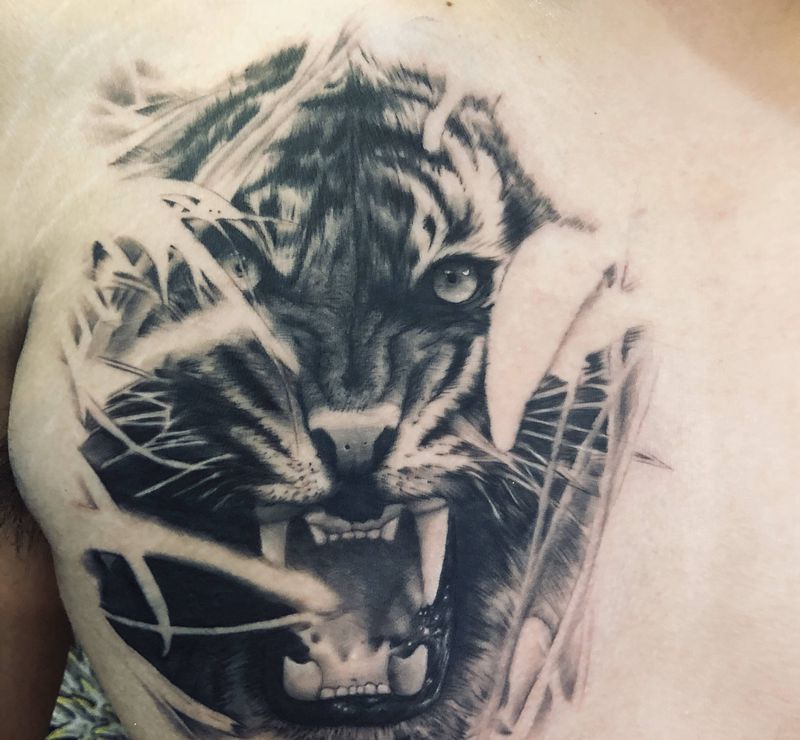 当前位置: 首页 >广东省深圳市纹身店-荆界纹身工作室纹身图案>写实老虎纹身图片_胸部欧美写实老虎写实纹身图案
