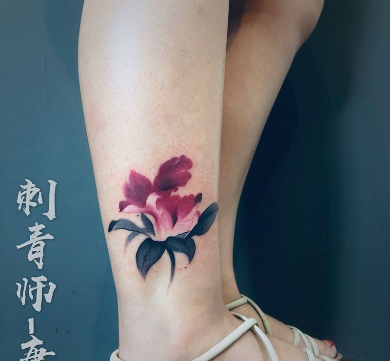 水彩(花)纹身图片_腿部水彩纹身图案