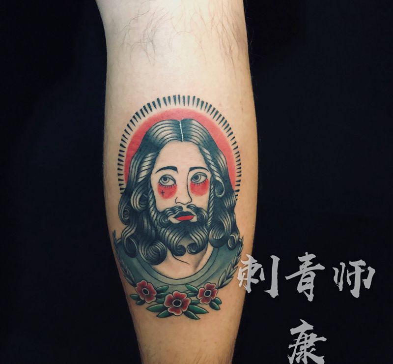 • T包小腿吹火男+阿多福纹身图片_腿部老传统新传统吹火男阿