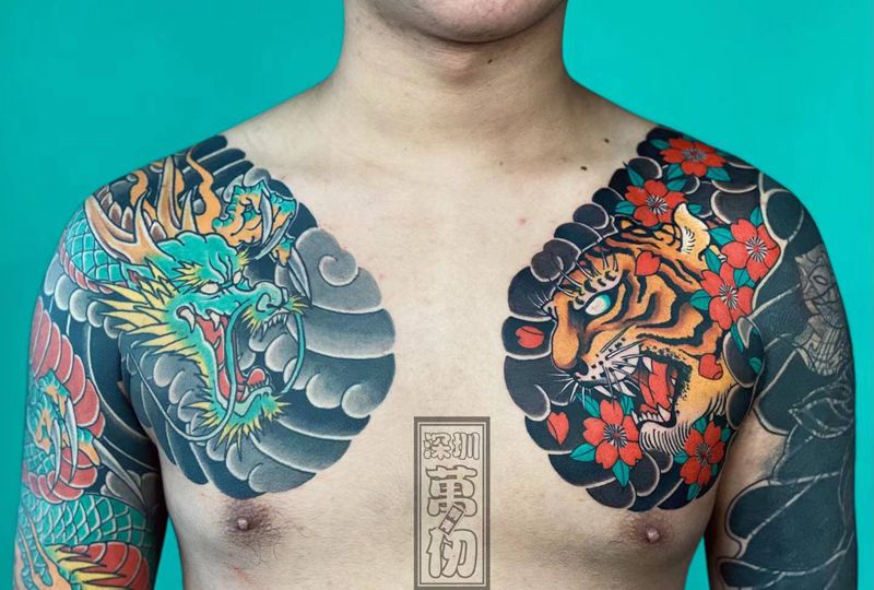 龙➕虎传统纹身图片_胸部肩部老传统新传统龙虎纹身图案