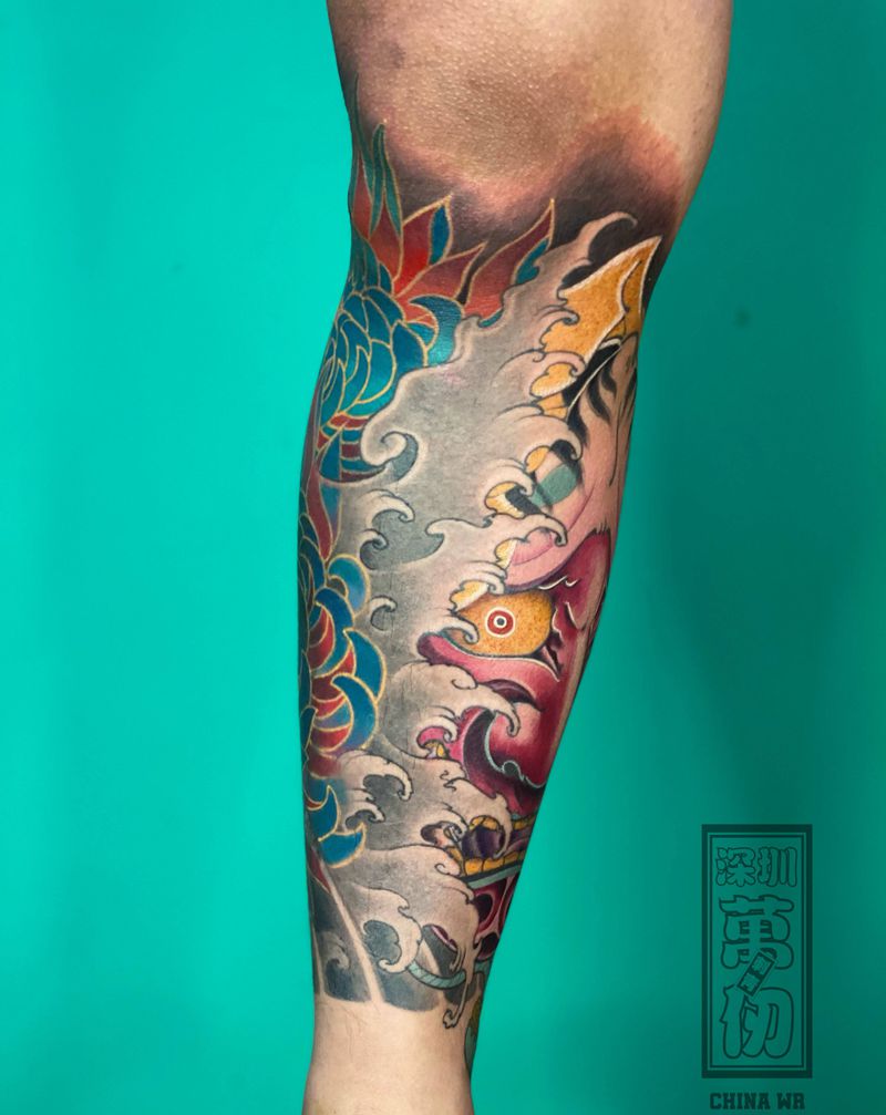 • T网红王老大花腿龙纹身图片_腿部新传统纹身图案