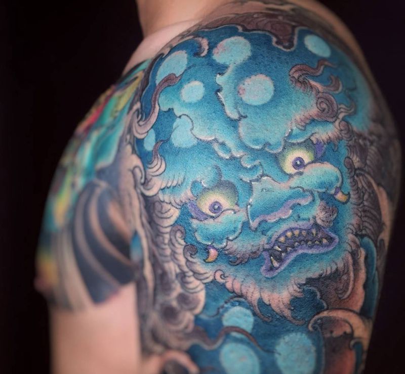 当前位置: 首页 >广东省深圳市纹身店-万仞刺青纹身图案>达摩逢唐狮纹身图片