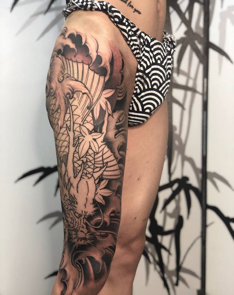 • T网红王老大花腿龙纹身图片_腿部新传统纹身图案