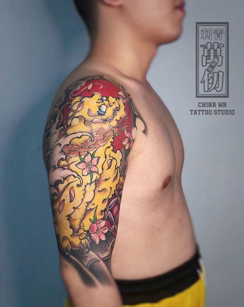 金光闪闪 福狮子纹身图片_手臂新传统纹身图案