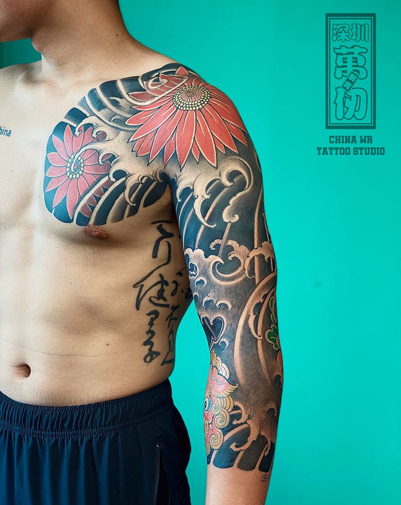 当前位置: 首页 >广东省深圳市纹身店-万仞刺青纹身图案>七分臂 / 雏菊小唐狮纹身图片_手臂老传统纹身图案