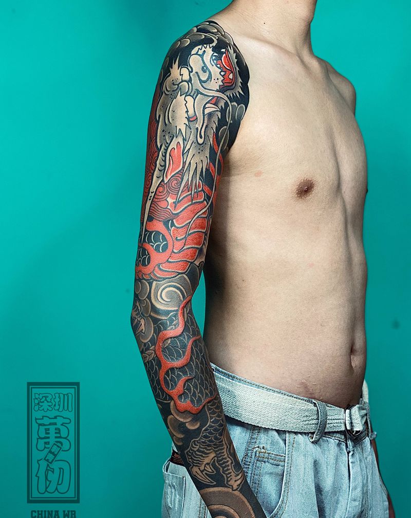 当前位置: 首页 >广东省深圳市纹身店-万仞刺青纹身图案>传统花臂 红龙纹身图片_手臂老传统纹身图案